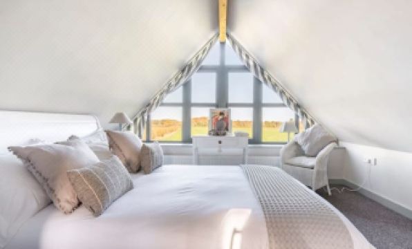 - From the stairs the main bedroom is located on your righ, through a small hallway where you access the bathroom on the left. The bedroom has king size sleigh bed (with Egyptian cotton bed linen), fitted wardrobes, dressing table, bedside table and side lamps. Large french doors leading to Juliette Balcony with wide uninterrupted views of the surrounding countryside to the east where you can see the sun come up over the horizon. For those not keen on the sunrise, sail-style lined curtains can be closed.