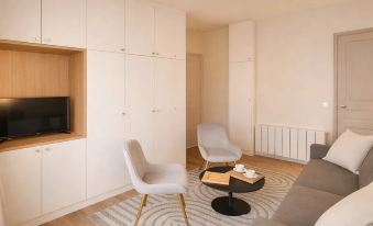 • A living room: convertible sofa bed for 2 people, Smart connected TV, storage and high-speed Wi-Fi access.