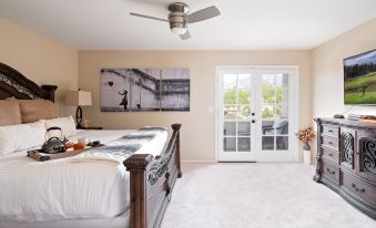 Primary Bedroom: King bed with smart TV and en-suite bathroom with balcony access.