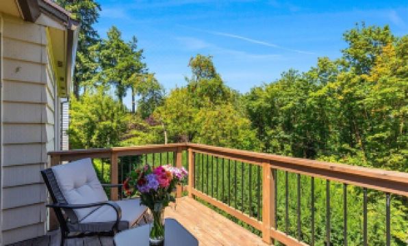 - Balcony offering serene forest views and a clear sightline to Mt. St. Helens