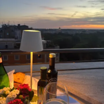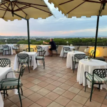 We debated this hotel or the Excelsior down the block but chose here for the rooftop bar. The staff was amazingly friendly and helpful. Allessio and Nickolas were so charming and attentive in the bar and restaurant. And Hannah was great at check-in. We love this area of Rome. Much quieter and upscale - less touristy too. We went to the rooftop almost nightly to enjoy the view and sunset. The same at breakfast for the early morning sunshine. We ate dinner here one evening and it was good. Our room was spacious for Europe and the bathroom modern.