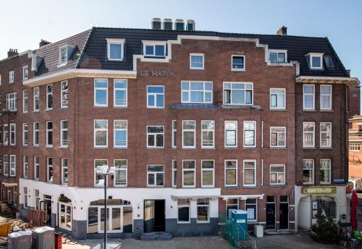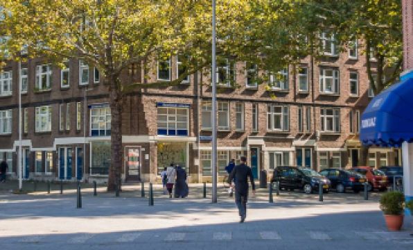 It's not the front store at the intersection, but a small door further down the street. The street is quiet and the leaves are falling on the roadside, which is nice.