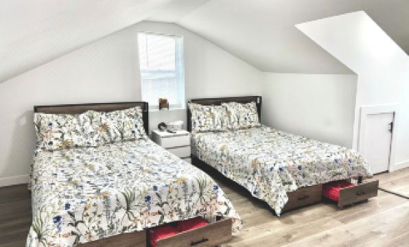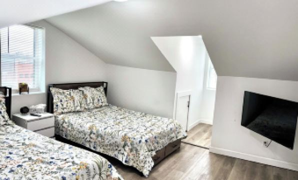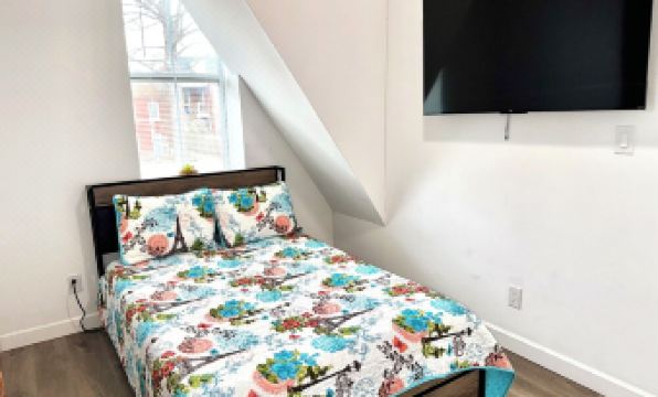 A short trip upstairs through all black modern stairs firsthand will find the second bedroom with white closet and 55’ class 4K smart TV and full-size bed with drawers and charging station,2USB Port & 2 power outlet.