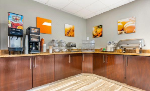 The location is right off the highway, so convenient to almost anywhere. Staff nice, friendly, it was quiet. Best thing about breakfast is the waffle imo...the sausage is terrible (that's any Comfort Inn I've booked). The bed looked inviting (clean linen, nicely made) but that mattress was not very comfortable. The metal mattress support clanked & squeaked with EVERY move or if you touched the bed. It definitely wasn't cleaned properly. Hair in the shower, bathroom floor & on the toilet seat lid as if someone had just combed their hair. Dust, hair, crumbs etc visible around the bed, under table/chairs. I bought my own cleaning products to clean/sanitize (I always do). But shouldn't have to do an entire bathroom cleaning. I was too tired to gather all my things & move for the 2nd night, besides I didn't want to potentially have to clean another room. I use Comfort Suites a lot, I usually stay at a different location, decided to try this one. The trim in the room and the lobby fell off by simply bumping into it. Unsure I would stay here again.