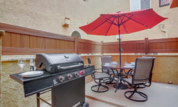 Step inside the ground floor entrance to a living area with sofa seating in front of a stacked-stone fireplace and flat-screen TV. The kitchen features stainless appliances, stone countertops, and backsplash, plus a convenient four-seat breakfast bar. There is an adjacent dining area with a table for up to six guests. Step through the glass sliding doors to the outdoor patio complete with outdoor seating, a gas BBQ and a dining table for four.
