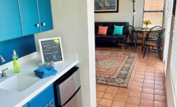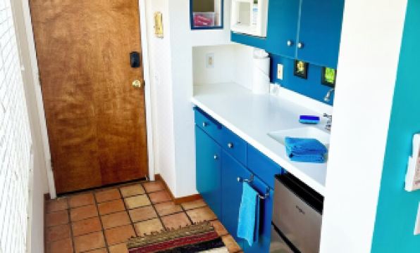 The kitchen nook includes cupboard space, a microwave, coffee maker, toaster, hot plate, and small refrigerator. There are dishes, utensils, cooking things, dish towels, salt/pepper, coffee, tea, sugar and creamer, and cleaning supplies. A hair dryer, iron, and ironing board are in the walk-in closet and ready for your use.