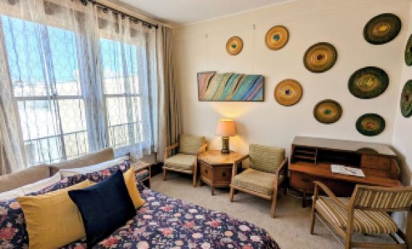 Room 1: This room has two large windows from which you can see Coit Tower and the Washington Square steeples. It has an L-shaped couch that converts to a very comfortable queen bed with a thick foam topper or can be kept as a couch and used as a living room. This room also includes a dresser with a secretary desk, 2 mid-century club chairs, and artwork made by us, the homeowners. This room gets lots of sunshine, fresh air, and you can enjoy some of the neighborhood sounds like parrots, church bells, and sidewalk musicians.