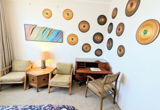 Room 4: This room also has a window with a view of Coit Tower and the Washington Square Park church steeples. My partner Aaron and I custom made the furniture. The design is rolling hills and sun rays above the mattress and sedimentary layers with inlaid gems below. The cabinets include a standing desk, vanity mirror, 3 general shelves, and a drop zone for glasses, wallet, and such. The raised bed has built in dresser drawers, a seated desk, and a sturdy ladder. There is a Full-sized Purple mattress with a large flat screen TV.