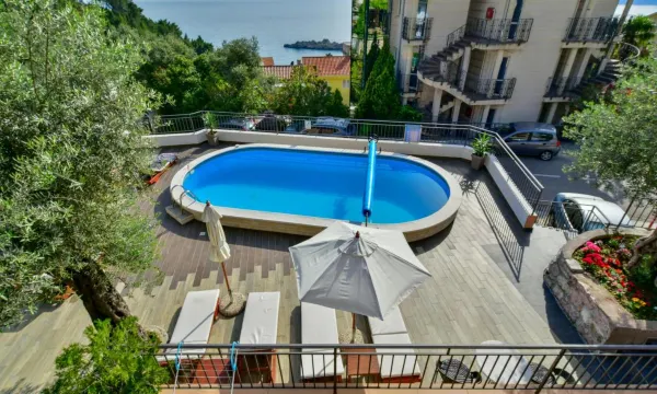 Когда мы ехали, мы учли, что до моря по лестнице вниз с горы идти, это самый главный минус, остальное всё на хорошем уровне, отличная кровать, шикарный сан.узел, брали с видом на море, вид прекрасен был, на балконе стол, два стула, кресло-кокон, есть плита, чайник, и вся посуда, чтобы приготовить еду, магазины рядом, кафе тоже, если что. В апартаментах есть завтраки, но порции скудные, поэтому завтраки мы готовили сами, а обедали в других местах, так как были на автомобиле и ездили по городам. Апартаментам 5*, если учитывать, что изначально вы едете на гору. А еще есть классный бассейн, всем места хватало, хоть он и небольшой, а также есть лежаки около бассейна. Пляж, если рассматривать около апартов, лучше спускаясь идти вправо к острову, там чисто и хорошо, если не берёте у кафешек. Места полно.