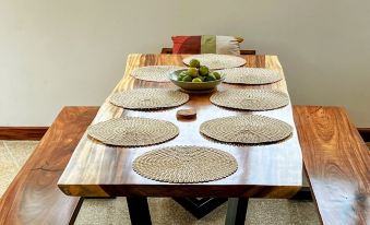 Our eight-seat dining room boasts a beautiful seven-foot Guanacaste wood table, and every room in the house has AC for maximum comfort. There are also 11 ceiling fans throughout the house and outdoor patios, along with blackout shades in the bedrooms and electric blinds in the first-floor living space.