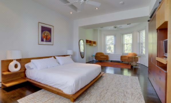 Welcome to Sojourn's 2-bedroom, 2-bathroom art gallery home which features open spaces with high ceilings, minimalist walls, and large windows for natural light. Polished hardwood floors, and modern fixtures enhance the space. Bedrooms are styled like serene art studios, with neutral and warm tones and clean lines. The bedrooms feature a queen sized bed on the first floor and a king size bed on the third floor.
