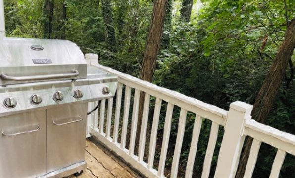 Cozy living room with a smart TV, seamlessly flowing into the open chef's kitchen, complete with a spacious island and stools for up to four guests. Modern kitchen equipped with granite countertops, stainless steel appliances, pots and pans, a Keurig coffee maker, toaster, and blender. Outdoor deck with grill (guests are responsible for filling the gas tank and cleaning the grill after use).