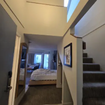 The room is a spacious loft unit. Its prime location in Whistler Village means the gondola is just a short walk away. On the ground floor, guests can enjoy complimentary coffee, milk, and hot water available 24/7. While breakfast isn't included, the front desk provides complimentary grab-and-go granola bars. Please note that parking is an additional $32 USD per day.