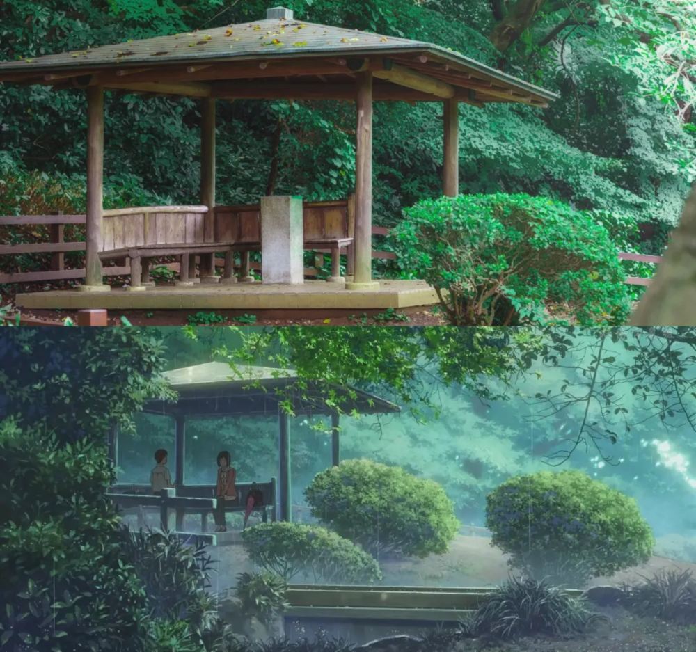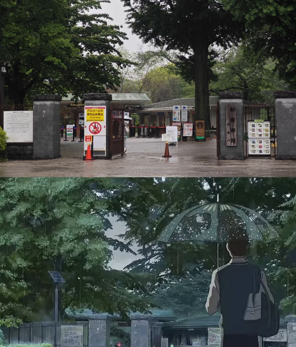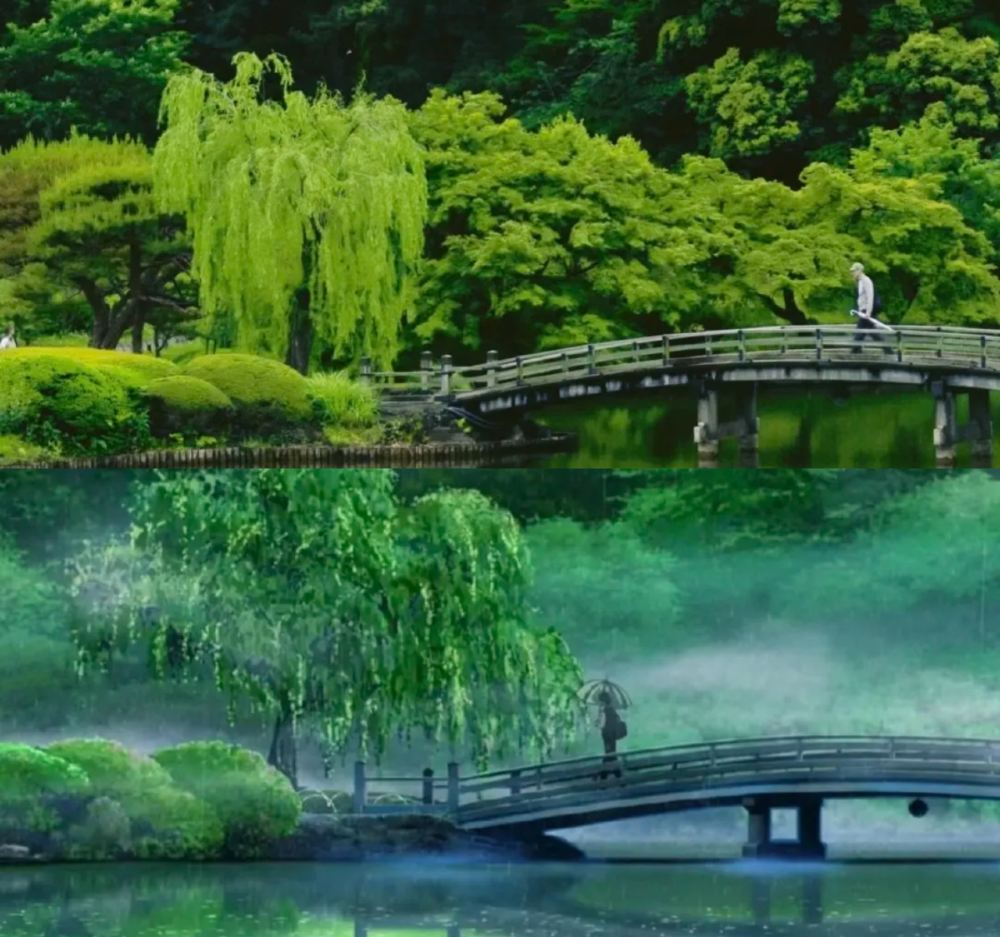 ▲ Kami-no-Ike - Taisho Wooden Bridge The Taisho Wooden Bridge is located within Shinjuku Gyoen National Garden, serving as a tranquil and elegant wooden structure spanning across the pond in the Japanese garden. In the film "The Garden of Words," this bridge appears during the scene where the protagonist Takao strolls through Shinjuku Gyoen. He quietly walks across the Taisho Wooden Bridge in the rain, immersed in his thoughts. Through delicate lighting and raindrop effects, the movie imbues the bridge with a dreamlike atmosphere, symbolizing the solitude and contemplation of growing up. In reality, the Taisho Wooden Bridge exudes a subtle Japanese aesthetic charm, evoking the film's nuanced emotions as visitors walk across it. The ripples from raindrops falling on the pond's surface create an immersive experience, as if stepping into Makoto Shinkai's visually poetic world.