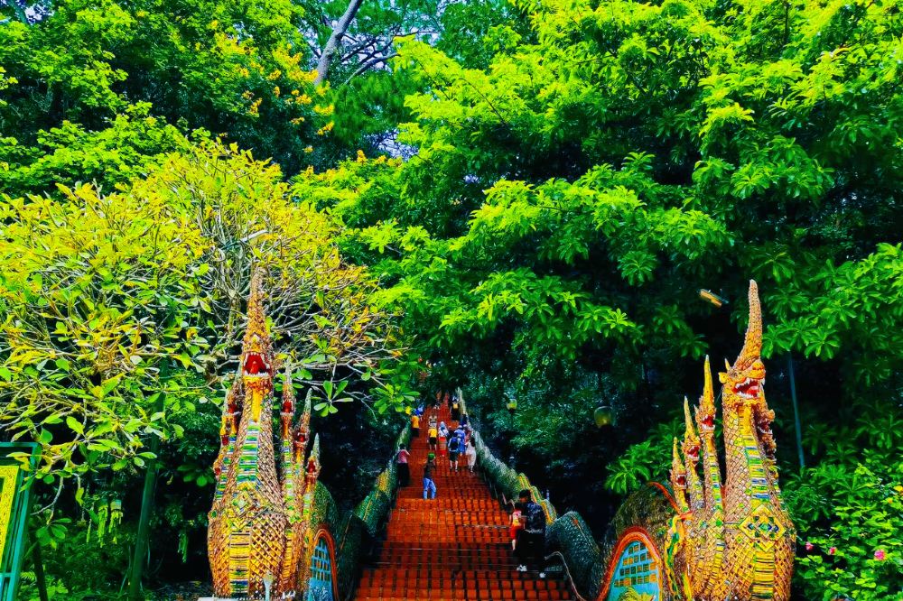 Wat Phra That Doi Suthep (also known as Wat Doi Suthep) is built on a high platform, requiring visitors to climb over 300 steps from the front of the temple. The railings on both sides of the stairs feature two colorful multi-headed naga serpents, each stretching dozens of meters long with uniquely designed shapes.