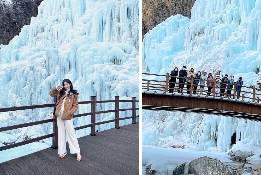 Marvel at the towering ice walls formed by frozen waterfalls, as if stepping into a fairytale-like winter wonderland